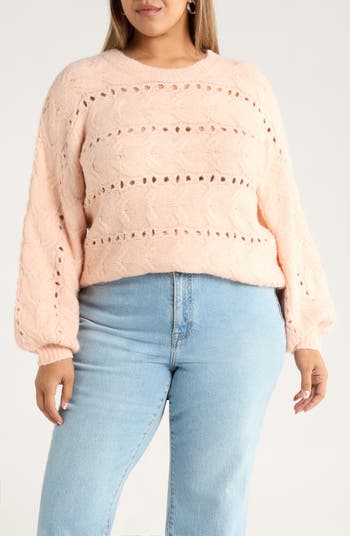 Balloon sleeves frame a fuzzy alpaca-kissed crewneck sweater juxtaposing cables with airy open stitching.