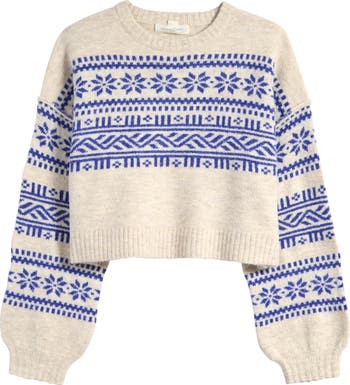 Voluminous, oversized sleeves frame this fuzzy crewneck sweater knit in a folksy Fair Isle pattern.