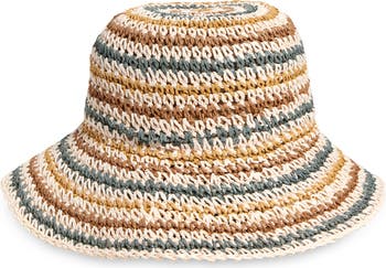 Top off your warm-weather looks with this playfully striped bucket hat crocheted from straw and finished with a face-shielding brim.