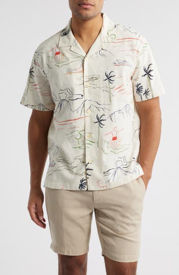 Tropical getaways inspire the colorful vignettes printed on a camp shirt made of linen and cotton with a lightweight feel that invites cooling breezes when it's sunny and warm.