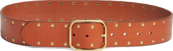 Golden studs punctuate the creased leather of a wide belt secured with a chunky square buckle.