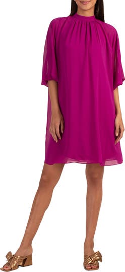 Go from desk to dinner in this breezy chiffon shift dress framed by a mock neck and billowy sleeves.