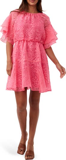 Burnout flowers enhance the whimsical charm of this flutter-sleeve dress fashioned with a relaxed blouson bodice and a pretty flounced hem.