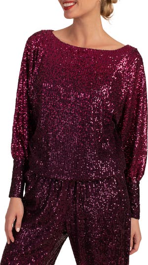 Take your look to glam new heights with this dolman-sleeve top covered in shimmery sequins.