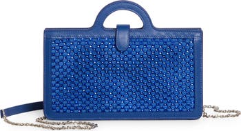 A royal-blue hue and radiant rhinestones embolden a clean-lined crossbody bag designed with a cutout carry handle and chain-and-leather strap.