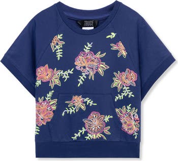 Embroidered blooms with beaded accents bring beautiful detail to a comfy French terry sweatshirt made with raglan sleeves.