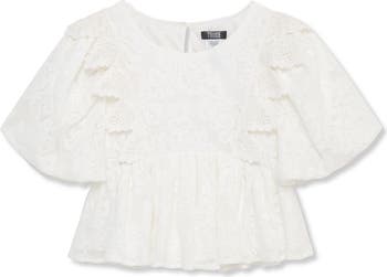 Sweeten their vibe in this lovely lace top that's framed by delicious puff sleeves and a fun flouncy hem.