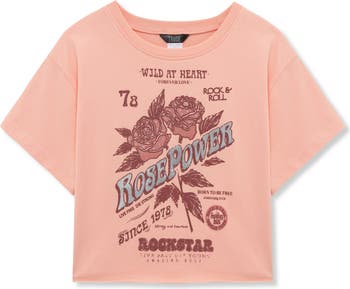 Sequin-studded roses keep the look glam in this concert-poster T-shirt made from soft cotton and left with a raw rolled hem.