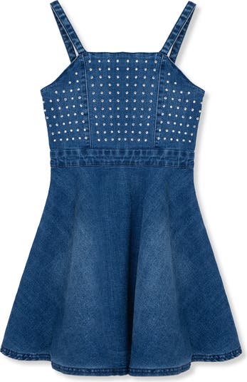 They'll love the rhinestones glimmering along the bodice of this stretch-denim dress featuring a flared skirt that moves playfully.
