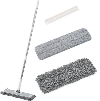 - Includes sweeper mop, 1 microfiber mop pad, 1 chenille mop pad