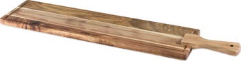 Partygoers will swoon over your tapas presentation atop this slender board crafted from stained acacia wood with a tapered handle and faux-leather strap for a rustic appearance.