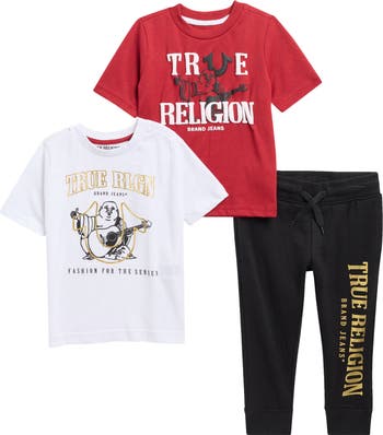 This casual three-piece set includes two graphic T-shirts and a pair of joggers infused with signature True Religion style.