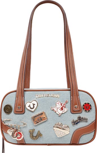 Branded pins decorate this denim satchel bag imbued with big brand energy and Y2K-inspired style.