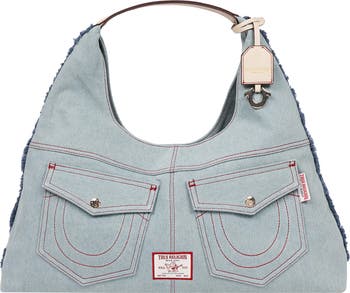 A polished hardware horseshoe and flap-patch pockets bring big brand energy to this denim satchel framed by fringey trim.
