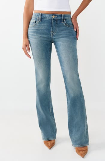 High-contrast stitching and the brand's signature horseshoe motif define a pair of studded bootcut jeans cut from stretch-enhanced cotton for day-off comfort.