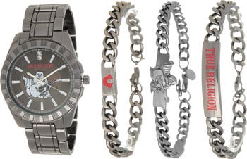 Mismatched chain bracelets can be stacked alongside the sophisticated watch in this set that features the brand's signature Buddha motif sitting perfectly inside the creamy-white dial.