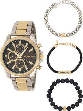 A perfect gift for a loved one, this set pairs a chronograph watch with four separate strap so that they can accessorize however they want.