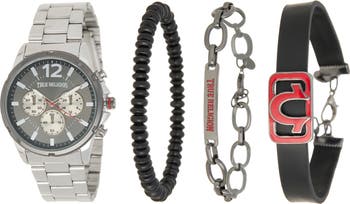 A trio of bracelets can be stacked alongside the sophisticated watch in this set that features the brand's signature logo and a multitude of subdials.