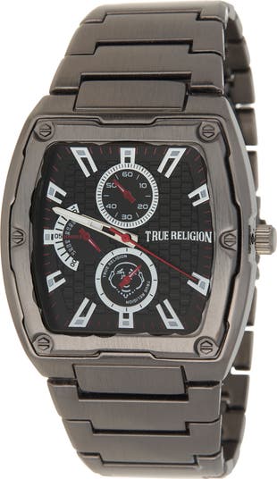 A trio of subdials increase the functionality of a sophisticated timepiece set on a polished bracelet.