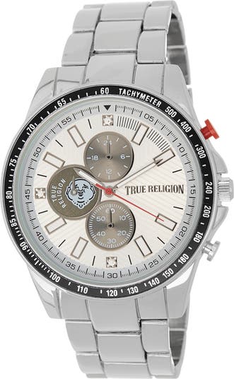 Brand-signature elements like a Buddha face and horseshoe motif define the trio of subdials of a polished timepiece that's powered by a reliable quartz movement.