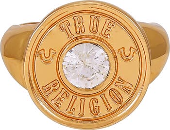 A round-cut crystal amps up the shine of this goldtone-plated ring boasting a button-inspired top etched with the brand's logo.