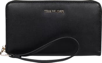 A brushed hardware logo brings signature style to a slim wallet-style wristlet fitted with a slender strap for hands-free carry.