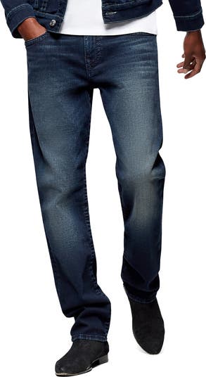 Elevate your denim style and your hem with the Geno Slim Big T Jeans. This slim fit men’s jean features subtle fading and 3D whiskering, sleek tonal stitching, and clean chrome hardware. Finished with tonal horseshoe detailing along the back flap pockets. Fit: this style fits true to size.