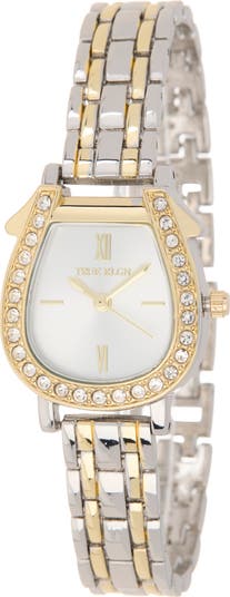 This bracelet watch showcases a unique horseshoe-shaped case accented with crystals and pairs an analog quartz movement for a blend of elegance and precision.