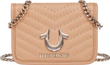 The brand's signature horseshoe motif lends heritage appeal to a studded crossbody bag shaped from faux leather textured with chevron pleats.