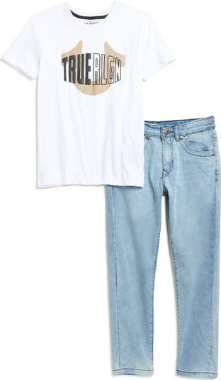 A horseshoe logo graphic adds bold brand style to a kid-approved T-shirt paired with coordinating denim jeans.