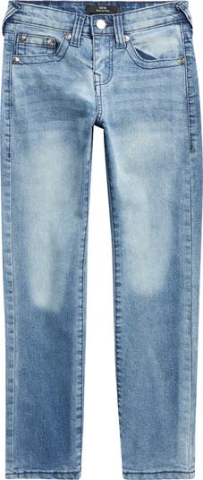 Embroidered logos on the back patch pockets bring signature brand style to these kid-approved straight-legged jeans cut from stretch-kissed denim.