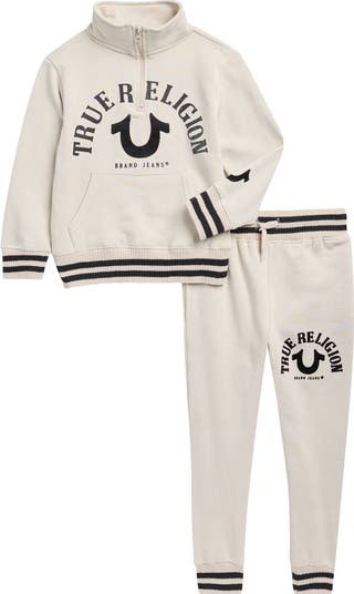 Striped ribbed-knit trim amplifies the sporty silhouette of a pullover and joggers set marked by the brand's signature horseshoe motif and arched logo.
