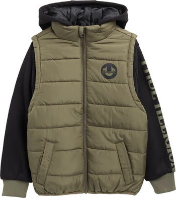 Keep your kid warm in this mixed-media jacket featuring a soft knit hood and sleeves attached to a cozy channel-quilted body complete with handy pockets.