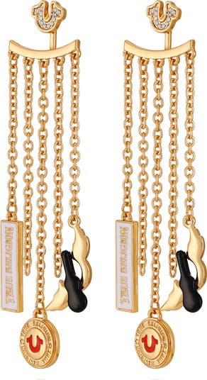 Logo charms bring heritage appeal to the chain drops of these polished earrings that bring bold, eye-catching style to your lobes.