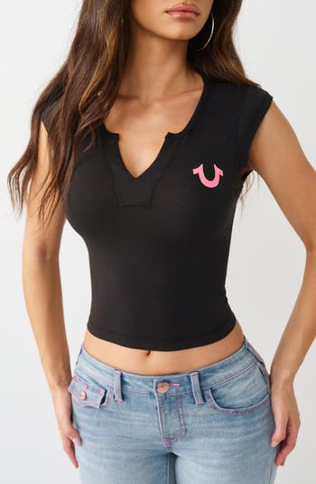 Bring some Y2K-inspired flair to your wardrobe with this notched-neck, cap-sleeve T-shirt featuring signature brand graphics at the chest and back.