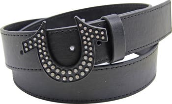 A rhinestone-adorned logo buckle secures this smooth leather belt that'll serve as a statement accessory in your wardrobe.