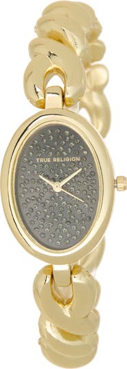 A curb-chain bracelet strap and oval dial dusted with light-catching crystals glamorize this quartz-powered timepiece.