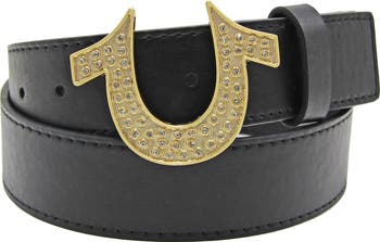 Add a touch of branded luck to your look with this sleek faux leather belt featuring a sparkly crystal-stone-covered horseshoe buckle.