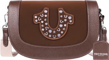 A gleaming studded logo adds a shining finish to a versatile, saddle bag featuring a soft crossbody strap for easy hands-free wear.