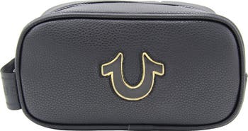 Carry your essential toiletries in this faux-leather dopp kit constructed with a side carry strap and bold logo hardware.