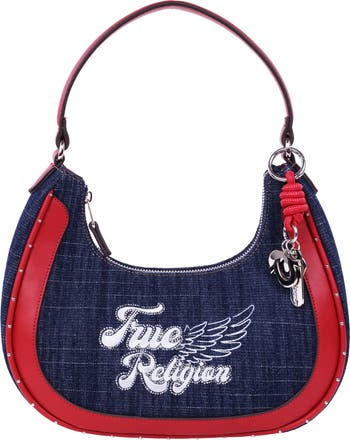 Shimmery rhinestones outline the brand's logo and wing motif at the center of a structured denim hobo bag neatly outlined by bright-red faux-leather trim.