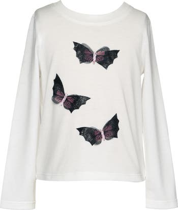 Sparkly 3D butterflies seem to morph into bats on a long-sleeve T-shirt made from stretch-enhanced cotton.