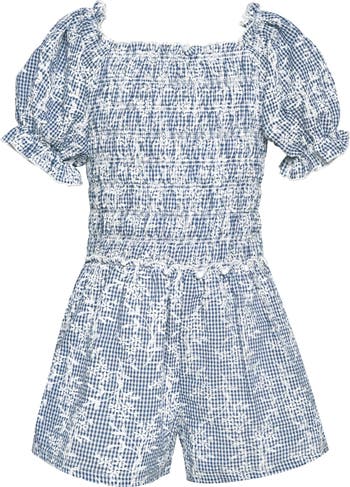 Sweet and sassy (just like her), this off-the-shoulder romper features a smocked bodice and darling puff sleeves.