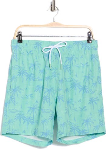 Dive in or kick back with ease in these palm-patterned swim trunks designed with a longer inseam and finished with on-seam pockets.