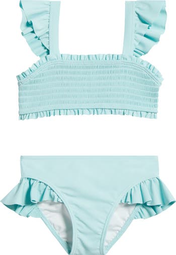 Playful ruffles and smocking sweeten the appeal of this splash-ready two-piece swimsuit.