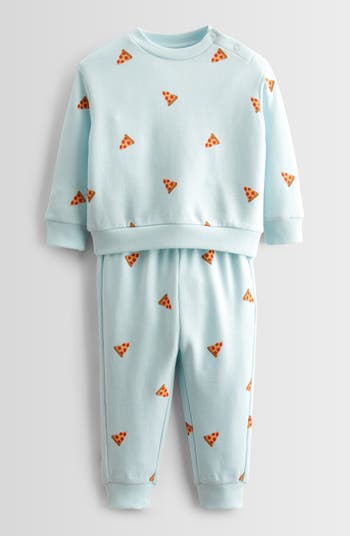 A fleece sweatshirt in a charming print is paired with joggers in this cozy everyday outfit.
