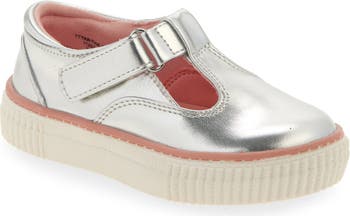 A cool metallic upper brightens the look of this classic mary jane flat styled with a hook-and-loop strap for easy, on-the-go adjustments.