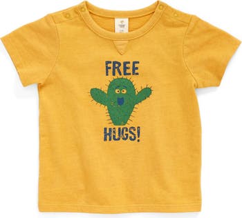 A playful graphic T-shirt features snaps at each shoulder for quick and easy style changes.