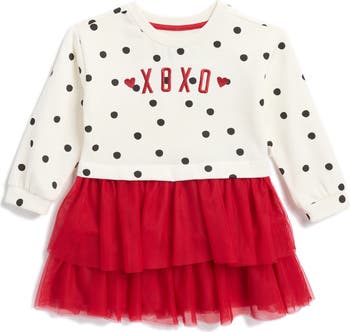 Embroidered hugs and kisses sweeten a polka-dot sweatshirt dress made with a bright red tulle skirt that's fanciful and festive.