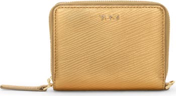 Signature logo hardware gleams against the smooth leather of a zip-around wallet packet with a variety of pockets to safely secure your cards, cash and coins.